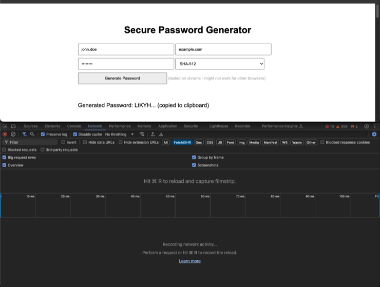 To verify this little web app does not communicate anything to the outside world, you can open the developer tools' network tab and see that no requests are made when the form is filled or submitted.